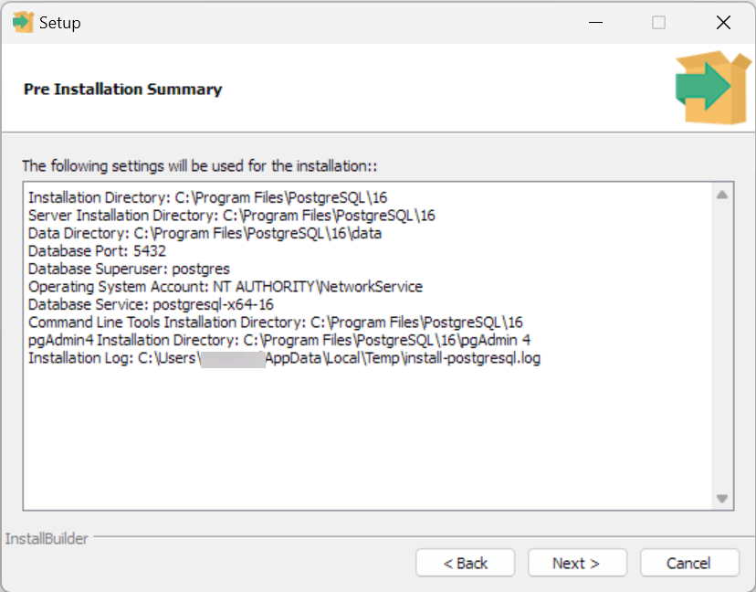 Step 9. The setup wizard will show the summary PostgreSQL information. Review the details, and if everything is correct, click the Next button. Otherwise, click the Back button to adjust the configuration accordingly.